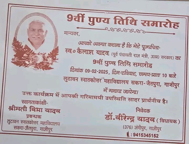 गाजीपुर, 7 फरवरी 2025 – पूर्व पंचायती राज मंत्री स्वर्गीय कैलाश यादव जी की 9वीं पुण्यतिथि के अवसर पर एक श्रद्धांजलि सभा का आयोजन किया जाएगा। यह कार्यक्रम 9 फरवरी 2025 को सुबह 10 बजे लुटावन स्नातकोत्तर महाविद्यालय, सकरा, (गाजीपुर) में संपन्न होगा।